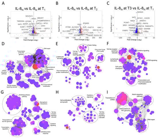 Analyses of immunocellular transcriptome from peripheral blood mononuclear cells from severe COVID-19 patients. (A–C) Differentially expressed genes (more than 2-fold change) shown in a volcano plot, analyzed from RNA sequencing data generated from peripheral blood mononuclear cells, compared between patients falling into the IL8hi group at time-point T1 (N = 9), designated T1hi, and patients falling into the IL8lo group at time-point T1 (N = 8), designated T1lo (A), between patients falling into the IL8hi group at time-point T2 (N = 7), designated T2hi, and patients falling into the IL8lo group at time-point T2 (N = 6), designated T2lo, (B) and, finally, between patients who were classified as IL8hi at time-point T1 (N = 5), designated T1hi, and ended up falling into the IL8lo group at time-point T3, designated T3lo (C). (D–F) Network depictions of major pathway groups enriched by genes upregulated in T1hi compared to T1lo (D), upregulated in T2hi compared to T2lo (E), and upregulated in T3lo compared to T1hi (F). (G–I) Network depictions of major pathway families enriched by genes downregulated in T1hi compared to T1lo (G), downregulated in T2hi compared to T2lo (H), and downregulated in T3lo compared to T1hi (I).