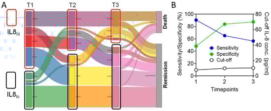 Plasma IL-8 dynamics parallel disease course and stratify final outcomes in severe COVID-19. (A) Sankey chart showing subgroups of severe COVID-19 patients variably falling into either IL8hi or IL8lo groups at three different time-points, stratified in terms of final outcomes. (B) Plot shows data from receiver operator characteristics analyses for plasma IL-8 levels at three time-points in terms of final fatal outcomes, showing the respective cut-off values (black line, right Y axis represented as percent) as well as sensitivity (blue line) and specificity (green line) for those cut-off values (left Y axis represented as plasma concentration of IL-8).