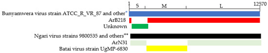 BUNV, BATV, and NRIV have a tri-segmented RNA genome: small (S), medium (M), and large (L). The S segment encodes the nucleocapsid protein (N) and a non-structural protein (NSs), which are translated from overlapping open reading frames (ORF). The M encodes glycoproteins (Gn and Gc) and a non-structural protein (NSm), and the L mRNA encodes the RNA-dependent RNA polymerase (RDRP) [3].