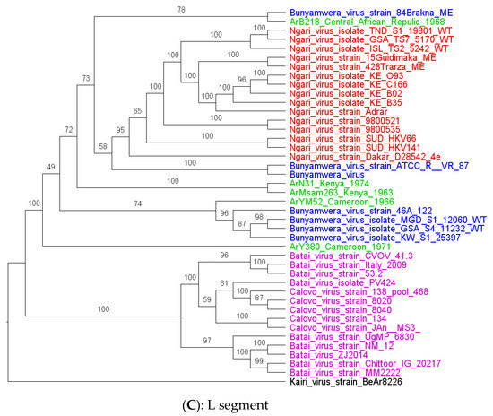 Maximum likelihood trees were obtained from the S (A), M (B), and L (C) segments analysis. Legends: study strain (green), Batai virus (pink), Bunyamwera (red), and Ngari (blue). The strain characterized in this study is colored purple.