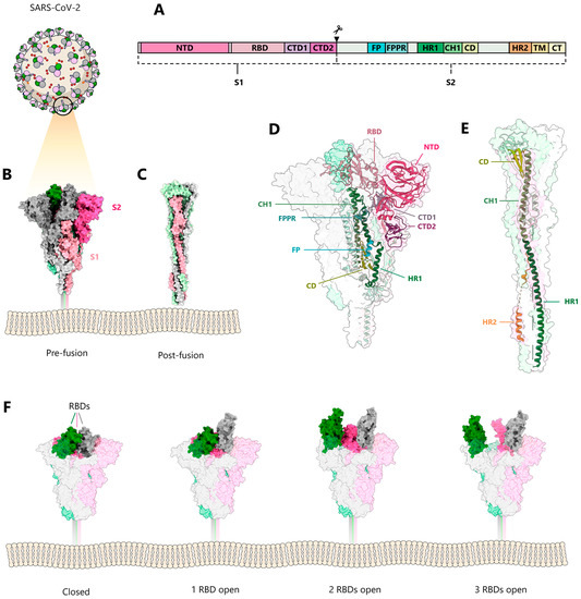 Conformations of the SARS-CoV-2 spike protein. (A) Model of SARS-CoV-2 and schematic representation of the domain structure of the spike glycoprotein S. (B) Side-view of the prefusion S trimer (PDB:6XR8) [35], showing the three protomers in grey, pink, and green, with the corresponding S1 subunits colored lighter than the S2 subunits. (C) Side-view of the post-fusion trimer (PDB:6XRA) [35]. (D) Side-view of the prefusion and (E) the post-fusion trimers shown as molecular envelope, with a single protomer illustrated as ribbon; the domains are colored as indicated in (A) (PDB:6XRA and 6XR8) [35]. (F) Conformational variability of RBDs in the prefusion spike; from left to right: closed (PDB: 6XRA) [35], one receptor-binding domain (RBD) in the up position (PDB: 7KRR) [48], two RBDs in the up position (PDB: 7EB5) [49], and three RBDs in the up position (PDB: 7KML) [50].