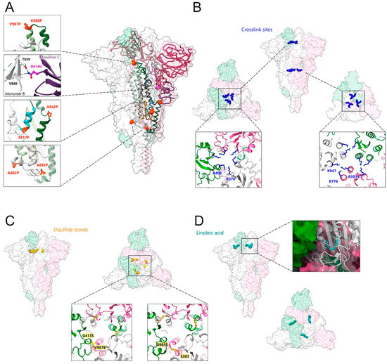 Strategies of SARS-CoV-2 spike protein stabilization. (A) Introduction of stabilizing mutations. Close-ups of the orange spheres represent proline substitutions K986P, V987P, F817P, A892P, A899P, and A942P (PDB:6XKL) [105]. Close-up of the violet spheres corresponding to the mutation of D614 to asparagine, which directly contacts T859 and V860 from the adjacent protomer; residue mutations at positions R82S and R685G are disordered (PDB:7A4N) [106]. (B) Chemical crosslinking by formaldehyde mediates the formation of covalent bonds between adjacent protomers by residues K378 and R408 (close-up to the left) and by residues K947 and K776 and/or R1019 (close-up to the right) (PDB: 7Q1Z) [107]. (C) The introduction of disulfide bonds between adjacent protomers at positions G413C and V987C (close-up to the left; PDB: 6ZOX) and at S383C and D985C (close-up to the right) (PDB: 6ZOY) [108]. (D) The binding of linoleic acid (in cyan blue) into an RBD pocket stabilizes the spike protein in the prefusion conformation (close-up to the right shows one of the RBDs in the ribbon accommodating linoleic acid) (PDB: 6ZB5) [109].