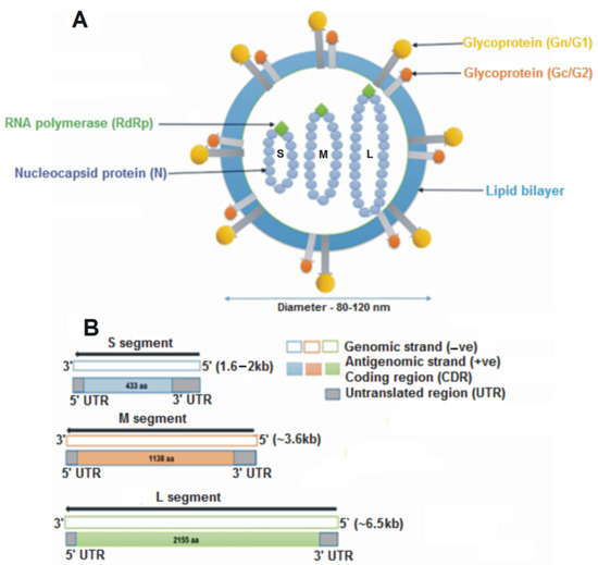 Schematic representation of an orthohantavirus virion. (A) The structure is spherical, having a diameter of 8–120 nm, enveloped with a lipid bilayer containing spikes of glycoproteins (Gn and Gc). Inside the virion are three segments of single-stranded RNA: small (S), medium (M) and large (L). (B) The S, M, and L genomic segments encode for the nucleocapsid protein (433 aa), glycoprotein precursor (1138 aa) and the RNA-dependent RNA polymerase (2155 aa), respectively.