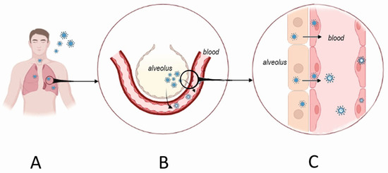 Orthohantavirus infection portal of entry and initial replication sites. Orthohantaviruses use the respiratory tract as one of the portals of entry (A). The initial replication site is believed to be in alveolar pneumocytes. From there, the virus crosses the respiratory membrane infecting nearby endothelial cells of the alveolar capillaries (B). These steps occur before the patient presents with HFRS symptoms. Once orthohantavirus infects endothelial cells, it becomes released into the blood leading to viremia (C). The immune system’s reaction to viremia could cause tissue damage, while increased endothelial permeability and blood coagulation could result from infected endothelial cell activation.