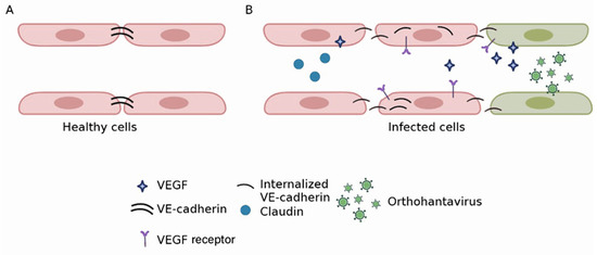 Orthohantavirus effect on endothelium barrier integrity. In uninfected endothelial cells, VE-cadherin is expressed in junctions between adjacent cells (A). In orthohantavirus-infected cells, a profound reorganization of VE-cadherin was described (B). It was shown that VE-cadherin becomes internalized in orthohantavirus-infected endothelial cells. This change in molecule expression appears to be a response to the binding of infected cells to VEGF. As a result, the integrity of adherence junctions becomes compromised, leading to increased endothelium permeability. Expression of claudin, a TJ molecule, decreased in orthohantavirus-infected cells. This would also contribute to the disintegration of cell adhesion and vascular leakage.