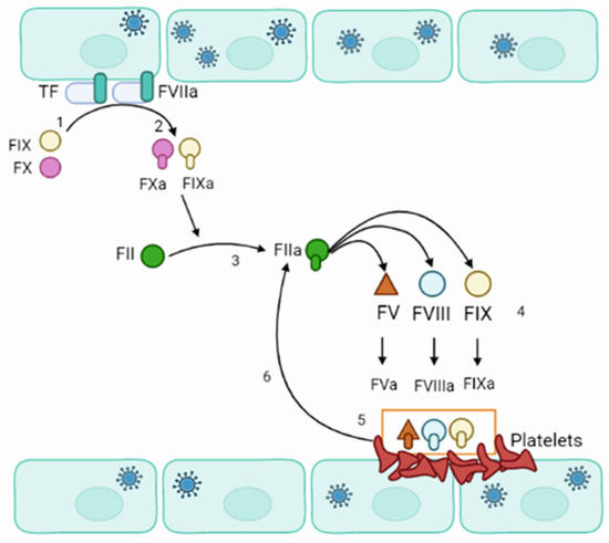 Additionally, an increased activity level of the circulating extracellular vesicle tissue factor was shown in HFRS [110]. More pro-coagulation of endothelial cells in orthohantavirus-infected patients is supported by finding glycocalyx degradation in HFRS [88]. Exposed TF could bind to factor VIIa and calcium to support the conversion of factors IX and X to active IXa and Xa, respectively [111]. Factor Xa binds to factor II to form the thrombin (factor IIa) [112]. Thrombin signals platelet activation and aggregation. Thrombin activates factors V, VIII, and XI on the platelet’s surface. The active VIIa forms a complex with active Va and Xa, which acts as a prothrombinase and accelerates the formation of Xa and thrombin. That will generate a large amount of thrombin and cleaves fibrinogen to fibrin monomers. Fibrin monomers start polymerizing and forming fibrin, the coagulation cascade’s final product.