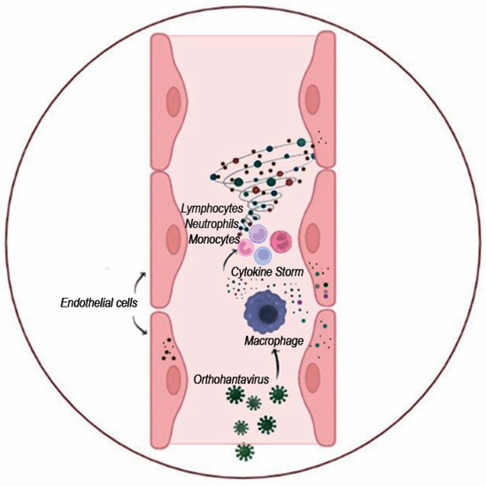 Release of cytokines and activation of the immune response: Human endothelial cells are mainly targeted by orthohantaviruses. Infections of these cells appear to be essential for compromised endothelium barrier function. Endothelial cells were also shown to produce and release cytokines, which was demonstrated in vitro [113,114]. After the initial replication in the lung epithelium, orthohantaviruses could infect the alveolar macrophages in proximity [115] (Figure 5). In addition, they could infect other cells, especially those initiating and propagating the immune response: macrophages and dendritic cells [116,117]. These leukocytes could disseminate the virus to other sites, deliver virus antigens to the lymph nodes, and contribute to the systemic cytokine release and “cytokine storm”. It should be noted that the systemic release of cytokines could further affect the endothelial barrier permeability and facilitate leukocyte adhesion and extravasation [118].