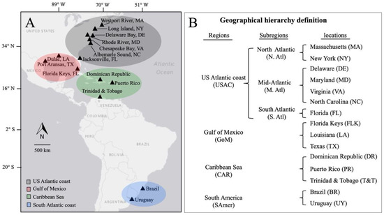 Map of sampling locations. (A) Shaded ellipses indicate larger geographic regions: US Atlantic coast (gray), Gulf of Mexico (red), Caribbean Sea (green), and South America (blue). (B) The geographic hierarchy definition of the sampling sites.