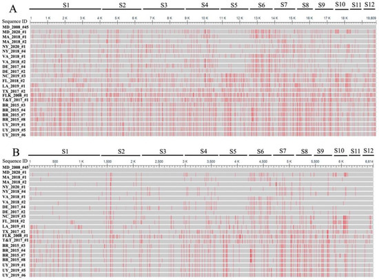 Alignment of concatenated CsRV1 whole genome nucleotide sequences (A) and translated amino acid sequences (B) visualized in NCBI alignment viewer. Red lines indicate differences from the MD 2008 X45 reference. S1–S12 indicate each of the 12 CsRV1 genome segments.