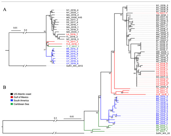 In total, 22 complete or near-complete genomes and 96 seg9 ORF sequences of CsRV1 were collected from 15 geographic locations along the US Atlantic coast (USAC), the Gulf of Mexico (GoM), the Caribbean (CAR), and South America (SAmer) between 2006 and 2021 (Table 1). The concatenated coding regions of all twelve segments (19,809 bp in total) for all 22 samples (hereafter referred to as ‘concatenated genome’) were compared to the published CsRV1 genome of MD-2008 #X45 [54]. The averaged sequence similarity between CsRV1 and the outgroup virus (SsRV WX_2012) was 64.4%. The nucleotide similarity across the 23 concatenated genomes of CsRV1 ranged from 97.3% to 99.7% (Figure 2A; Supplementary Figure S1A). In the USAC, virus strains sampled from different states had 98.4–99.5% nucleotide similarity within the region. In the GoM, CsRV1 genome sequences from TX and FLK shared 97.8% nucleotide similarity with one another. However, the genome of the LA strain (at the GoM) showed higher nucleotide similarity (>98.5%) with CsRV1 strains of the USAC rather than the GoM (<98.2%). The Trinidad and Tobago CsRV1 genome of the CAR had low nucleotide similarity with other geographic locations (97.3–97.9%). In SAmer, Brazil and Uruguay showed high nucleotide similarity within the region (99.3–99.7%), whereas they shared low sequence similarity with other locations (<98.6%) (Supplementary Figure S1A).