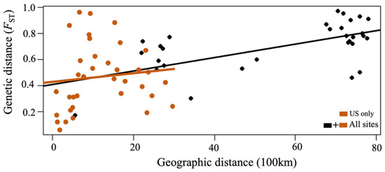 Isolation by distance. Genetic distance of AMOVA-based FST versus geographic distance (geographical distance in ×100 km) is plotted for all pairwise comparisons among populations of the CsRV1 based on seg9 nucleotide sequences (843 nt). The black regression line is based on all the points, and the orange line is for only US sites. A correlation was detected with a Mantel test (p < 0.01 for all sampling sites; and p > 0.1 for only US sites).