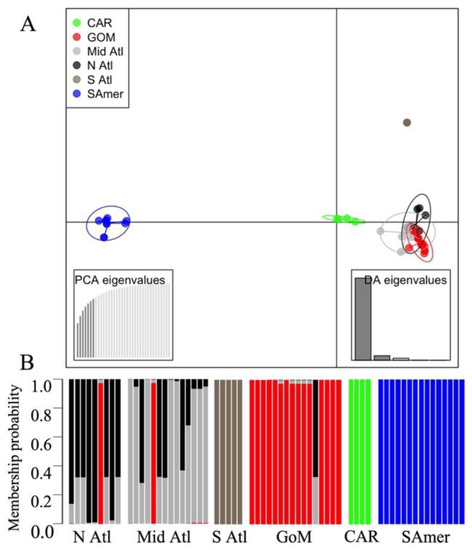 Seven principal components (78.7% of variance conserved) of PCA and five discriminant eigenvalues were retained for DAPC analyses with seg9 sequences based on the a-spline optimization results. K-means cluster analysis revealed that the most likely number of clusters (K) in the data was 4–5 based on a consensus of three metrics used to infer the most probable K (Elbow, Silhouette, and Gap Statistic Method). The scatter plot in Figure 5A shows the first two linear discriminants for all analyzed samples using the sample locations (n = 6) as the pre-defined clusters. All the CAR and SAmer genotypes were placed into distinct groups, and the SAmer showed the largest distance relative to other groups. Within the US, the S. Atl genotypes (exclusively collected from FL) grouped far away from the N. Atl and M. Atl populations. The N. Atl, M. Atl, and GoM populations appeared to overlap substantially with each other. Consistently, the membership probabilities of each genotype show two unique groups of the CAR and SAmer genotypes (Figure 5B). US N. Atl and M. Atl strains showed potentially high levels of admixture or equal probability of membership to either population, whereas the S. Atl samples were more distinct and had high membership probabilities to their “home” population. The GoM genotypes formed a single group, but some genotypes had apparent overlap with North and Mid-Atlantic genotypes and showed strongly deviating membership probabilities relative to their population of origin. For example, two genotypes of the M. Atl and N. Atl were assigned to GoM, and one individual from GoM was primarily assigned to N. Atl or M. Atl. Furthermore, potential admixture between CsRV1 from M. Atl and GoM was suggested for some genotypes (Figure 5B).