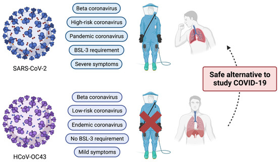 Comparison of major characteristics of SARS-CoV-2 and HCoV-OC43. Despite belonging to the same beta coronavirus, HCoV-OC43 is classified as an endemic coronavirus. In addition, due to its mild clinical symptoms, its biology can be studied under the BSL-2 research setting. Therefore, HCoV-OC43 can serve as a good research alternative to SARS-CoV-2. This illustration was created with BioRender.com.