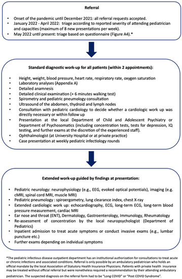 Soon after the onset of the pandemic, repeated inquiries for pediatric patients with post-SARS-CoV-2-infection symptoms reached the Pediatric Infectious Disease Department for detailed assessment. Patients were referred from pediatricians, family physicians, primary care physicians and outpatient and inpatient pediatric specialists (Figure 1).