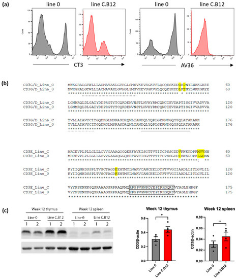 Polymorphisms in CD3 of line 0 and line C.B12 birds. (a) Flow cytometric analysis of splenocytes of 4-week-old line 0 (black) and line C.B12 birds (red), stained with mouse anti-chicken CD3 clone CT3 or mouse anti-chicken CD3 clone AV36. Cells were gated on 10,000 live, single CD45+ cells. Representative of five birds. (b) Comparison of the CD3 chains between line C and line 0. Dotted lines represent the transmembrane domain, and the underline represents an ITAM domain. Differences in the amino acid sequence between the lines are highlighted in yellow. The boxed area is the epitope recognised by the CD3-12 antibody. (c) Representative images of western blot analyses for lymphocytes from the lung, thymus and spleen of two 12-week-old line 0 and line C.B12 birds using the anti-CD3ε clone CD3-12 (left panel). Quantitative analyses for CD3 levels relative to the actin from thymus (middle panel) and spleen cells (right panel) are shown. Data points are for cells collected from individual birds (n = four per line). * p < 0.05.