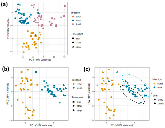 Principal component analysis (PCA) of the global gene expression of viral innate immune-related genes in lung macrophages using Fluidigm qPCR array. Lung macrophages were isolated from line 0 and line C.B12 and in vitro-infected or stimulated for 6, 24 or 48 h (n = five birds per line; three-way split over treatments and timepoints). (a) PCA plot of collated data from line 0 and line C.B12 showing clustering of the samples in terms of infection/stimulus: H7N1-infected (orange), mock (blue) and R848-stimulated (pink). (b,c) PCA plots of lung macrophages infected with H7N1 (orange) or mock (blue) indicate clusters and transcriptional differences in gene expression related to the (b) timepoint and (c) genetic line, with the C.B12 cluster highlighted in a black-dashed ellipse and the line 0 cluster highlighted in a blue-dashed ellipse.
