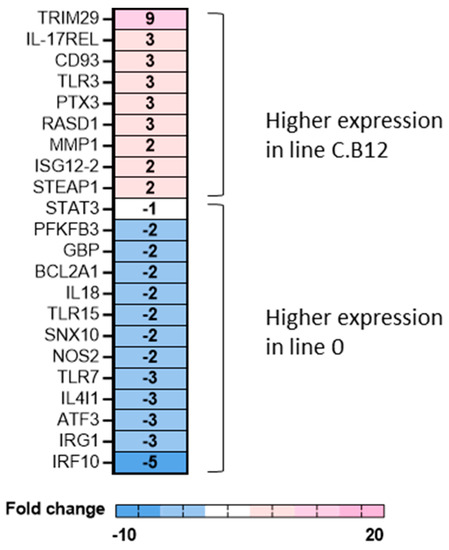Hereditary differences in innate immune gene expression in lung macrophages from line C.B12 and line 0 chickens. Significant DEGs were identified by comparing the relative expression values, calculated through comparison to the maximum Cq for individual genes for lung macrophages from mock/untreated line C.B12 and line 0 chickens, with a significance level set at p < 0.05; fold change >1 (n = five per line). Heat map illustrates the mean fold change associated with significant DEGs between line C.B12 and line 0, and the fold change values are specific to line C.B12 (i.e., C.B12 v line 0). Fold change values are represented on a divergent, intensity colour scale showing the expression of upregulated genes (pink) to downregulated genes (blue).