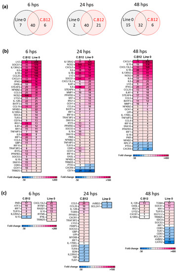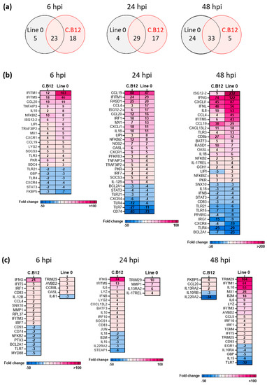 H7N1 infection of lung macrophages shows differences in the immune response kinetics and intensity between susceptible and resistant lines. Significant DEGs were identified by comparing the relative expression values for H7N1-infected lung macrophages to their corresponding mock control, and this was performed intra-line (i.e., C.B12 infected v C.B12 mock) and individually per timepoint, with a significance level set at p < 0.05; fold change >1 (n = five/line/time-point). (a) Venn diagrams presenting unique and shared numbers of significant DEGs of line 0 and line C.B12 in response to H7N1. (b) Heatmaps illustrating the fold change associated with significant DEGs that are shared among line 0 and line C.B12 and are (c) unique to a specific line at 6 hpi, 24 hpi and 48 hpi. Fold change values are represented on a divergent, intensity colour scale showing the expression of upregulated genes (pink) to downregulated genes (blue).