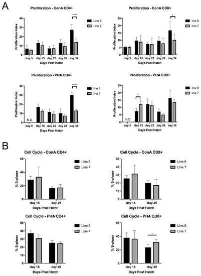 Uninfected line 6 and line 7 mixed-sex chicks were housed as in experiments 1–3, and humanely euthanized for spleen collection at the specified timepoints. Spleens from 15-day-old birds were pooled in groups of 2; spleens from 29-day-old birds were assayed individually; n = 6 pools or individuals per group at each timepoint. Spleens were homogenized as in proliferation assays. Splenic lymphocytes were purified by two rounds of gradient centrifugation over Histopaque-1077 (MilliporeSigma) and further cultured for 48 h with 10 μg/mL ConA or 100 μg/mL PHA as in the proliferation assays, then pulsed for 1 h with 1 μL 5-ethynyl-2′-deoxyuridine (EdU)/2 mL sample using the Invitrogen™ Click-IT™ EdU Alexa Fluor™ 647 Kit (product #C10424, Thermo Fisher Scientific) and click-labeled for EdU detection according to the manufacturer’s protocol. Cells were immunolabeled with anti-CD4-FITC (clone CT-4, Southern Biotech) and anti-CD8α-PE (clone CT-8, Southern Biotech) antibodies subsequent to click-labeling and analyzed on a BD FacsCalibur machine. Flow cytometry data were analyzed for percent S-phase in Flowjo, v.10. Flow gating was performed for scatter characteristics (FSC x SSC), and gated cells were subgated into CD4+ CD8α- and CD4- CD8α+ populations. Percent S-phase was calculated as the proportion of Edu+ cells within each population.