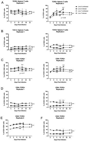 We examined the αβ (conventional) TCR repertoire of splenic cells in line 6 and line 7 chickens with and without MDV infection over time, via flow cytometry (Supplementary Figures S2 and S3). As shown in Figure 2A,B, CD3+ T cells from both lines expressed TCR2 (chicken T cell antigen corresponding to TCRαβVβ1) more frequently than TCR3 (corresponding to TCRαβVβ2), (consistent with previous literature on TCR usage in the chicken [33]); however, line 6 splenocytes were more strongly biased towards TCR2, with 50–65% of their cells expressing TCR2, and only about 10% expressing TCR3. In contrast, 20–30% of line 7 splenocytes expressed TCR3, with a proportional reduction in TCR2 compared to line 6. During infection, the proportion of TCR2+-expressing CD3+ splenocytes increased in line 6 only in replicate 2 (p = 0.026 at 8 days post infection), and in both lines in replicate 1 (p < 0.05 for both lines by 21 days post infection) (Figure 2A); however, expression of TCR3 was minimally affected by infection status, suggesting that TCR3+ cells may respond poorly to MDV antigens (Figure 2B). In replicate 2, splenocytes were examined on day 0 of infectious challenge, i.e., 1 day of age; interestingly, TCR2+ cells were much less frequent in both lines at 1 day of age, while TCR3+ cell frequency was intermediate between lines at this earliest timepoint and diverged within the first week of life (Figure 2A,B).