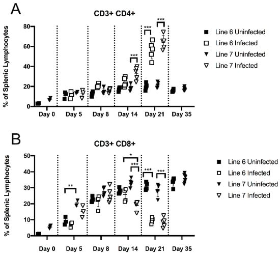 We compared CD4+ CD3+ and CD8+ CD3+ T cell frequencies within the spleen of line 6 and line 7 birds in replicate 2 (Figure 3A,B). CD4+ and CD8+ T cell frequencies increased in both lines over the first 8 days after hatching, with no effect of infection on these populations until day 14, when CD4+ T cells began to increase; this was significant (p < 0.001) in the MD-susceptible line 7 birds. CD4+ T cells were strongly increased in both lines by day 21 with infection (p < 0.001), from 16–25% of the splenic lymphocyte population in controls to 44–74% in infected birds (Figure 3A). Conversely, CD8+ T cells were proportionally reduced from 22–32% of splenic lymphocytes in uninfected birds to 5–12% in infected birds by day 21 (p < 0.001), with no statistically significant difference between lines in either CD4+ or CD8+ T cell percentage at 21 days post-infection (Figure 3B).