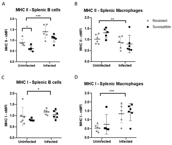 Experiment 3: Spleens were homogenized in LM media as in experiments 1 and 2, washed and cryopreserved in freezing medium containing 10% DMSO and 17% FBS at −80 °C for later analysis. Frozen samples were thawed quickly (less than 1 min) on a 95 °C heat block to prevent macrophage lysis. Thawed samples were washed in LM media, strained through wire mesh and then filtered through Falcon™ 35 μm cell-strainer caps (product #352235, Corning, Corning, NY, USA) to remove aggregates. One million cells per sample were immunolabeled with each of 2 antibody panels: Monocyte/macrophage-Alexa Fluor™ 647 (clone KULO1) and Bu-1-Pacific Blue (clone AV20) and either MHCI-FITC (clone F21-2; panel 1) or MHCII-FITC (clone 2G11; panel 2). All antibodies were obtained from Southern Biotech, Inc. Immunolabeling was performed as in experiments 1 and 2; samples were kept on ice at all steps. Flow cytometry was performed on a Novocyte cytometer (Agilent Technologies, Santa Clara, CA, USA), and analysis was performed in FlowJo™ v. 10; samples were singlet-gated, gated for mononuclear cells on FSC/SSC, and population-gated into KULO1+ and Bu-1+ populations before measurement of MHCI or MHCII expression as median fluorescent intensity (MFI). To minimize sample processing time, samples were processed in batches containing 3 samples from each group, and MFIs were normalized to the batch average (nMFI) prior to statistical analysis. One sample was removed from analysis in the line 7 uninfected group due to poor cell recovery. nMFI for each sample was calculated as: