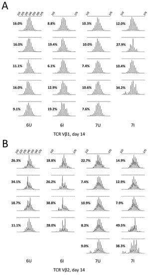 TCR spectratyping of splenocytes from MHC-matched lines. Divergence scores in comparison to controls within each line are indicated as percentages, and horizontal scale axes indicate fragment size. Individual control birds are compared to the remaining controls of the same line. (A) TCR Vβ1 and (B) Vβ2 PCR fragments at 14 days post-infection with MDV. Each spectratype image represents an individual bird from line 6 or line 7, without MDV infection (columns 6U, 7U) or with MDV infection (columns 6I, 7I); 4 or 5 birds were spectratyped in each group.