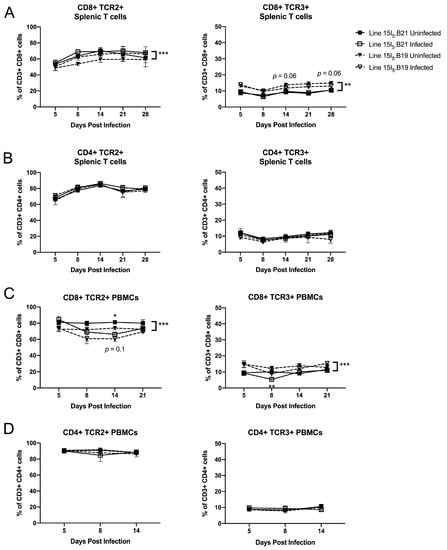 TCR frequency in MHC congenic lines. Days post-infection with MDV are indicated. TCR families were differentially responsive to MHC haplotype and MDV infection in CD8+, but not CD4+, T cells in both splenic and peripheral blood pools. (A) TCR2+ and (B) TCR3+ frequency in splenic T cells. (C) TCR2+ and (D) TCR3+ frequency in peripheral blood T cells. * p < 0.05, ** p < 0.01, *** p < 0.001. Infected and uninfected birds of each line are compared by Tukey’s test. Line differences by ANOVA are indicated on the right. n = 4 individual birds per group at each timepoint.