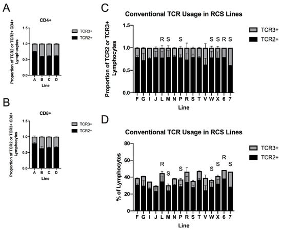 TCR frequency in RCS lines. TCR frequency in RCS lines A-D was compared within (A) CD4+ and (B) CD8+ peripheral blood mononuclear cell populations. (C) TCR frequency within RCS lines F-X was compared within all cells expressing TCR2 or TCR3 within the lymphocyte gate on FSC vs. SSC. Parental strains 6 and 7 are included as controls. Relatively resistant and susceptible lines are indicated with “R” or “S” where known. (D) TCR frequency within RCS lines F-X was compared within the total peripheral blood lymphocyte population as gated on FSC vs. SSC. Relatively resistant and susceptible lines are indicated with “R” or “S” where known. Two hens from each line were assayed.