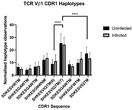 In order to estimate TCR Vβ1 gene usage at the mRNA level, we compared the usage of Vβ1 CDR1 haplotypes in a pre-existing Illumina RNA-seq dataset from MDV-infected and uninfected spleens of first-generation (F1) hybrids of line 6 and line 7, at 4 days post-infection (18 days of age) [28]. Using Freebayes, we identified nine different 32-bp (ten-amino acid) haplotypes within the CDR1 site, each uniquely identifiable as one of the twelve haplotypes identified by DNA sequencing (Supplementary Figure S6), and estimated usage of each haplotype within the sample (Figure 8). At 4 days post-infection, there was no significant change in usage of any TCR Vβ1 gene within the total TCR Vβ1 pool between infected and uninfected birds. However, the CDR1 amino acid sequence “SHKESVIQTM” (with glutamine falling at position 44) was over-represented in both infected and uninfected samples, with a haplotype from the line 7 parentage encoding this sequence comprising approximately 25% of haplotype observations. Surprisingly, a line 6 haplotype that also encoded this sequence (with a synonymous SNP) was observed less than half as frequently; the only definitive difference between these two haplotypes that could be inferred from the longer DNA-based haplotype is a Val-Leu substitution at position 53 in the variable region’s C-C’ loop (which is expected to form part of the Vα-Vβ interface), although it is possible that these TCR Vβ1 genes contain important sequence differences further from the CDR1 region, e.g., at the CDR2 or CDR3 loops. Three CDR1 haplotypes identified in the DNA sequence data (two from line 6 and one from line 7) were not observed within the RNA sequence data, at the detection threshold used in our analysis.