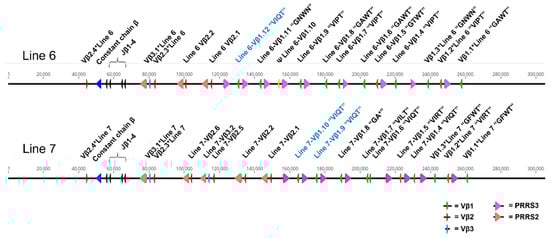 Similarly to the Illumina data, CDR1 haplotypes were identified for each Vβ1 gene in both lines (shown in Supplementary Figure S10); most previously identified haplotypes could be identified within the assembled PacBio data, with the exception of SHKESVIRTMF and SHKESGFWTMF in line 6. Conversely, genes containing the haplotypes SHKESGTWTMF in line 6 and SDKESVILTMF in line 7 were present in the assembled PacBio data but were not previously identified in the Illumina data; these may contain sequencing errors and their sequences should be confirmed by targeted resequencing. The most common CDR1 haplotypes in line 7 were SDKESVIRTMF, SDKESVIQTMF, and SHKESVIQTMF, each of which was represented by two genes. In line 6, SHKESVIPTMF was represented by three genes, and SDKESGAWTMF was represented by two; the “VIQT” motif was only represented by one gene in line 6. Figure 8 shows the reconstructed model of the TCRβ loci in line 6 and 7, with the single shared CDR1 haplotype in Vβ1, SHKESVIQTMF, highlighted between the lines; coding sequences for Vβ1 and Vβ2, and full sequences for putative Vβ3, are provided in Supplementary Figures S10–S12.