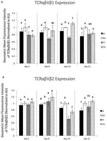 TCRαβVβ expression on CD3+ splenocytes. Geometric mean fluorescence intensity of (A) TCRαβVβ1 (TCR2) and (B) TCRαβVβ2 (TCR3) staining of gated CD3+ TCR+ cells from samples shown in Figure 2A,B, replicate 1. Non-overlapping letters indicate significant difference within days by p < 0.05 on Bonferonni-corrected Student’s t test.