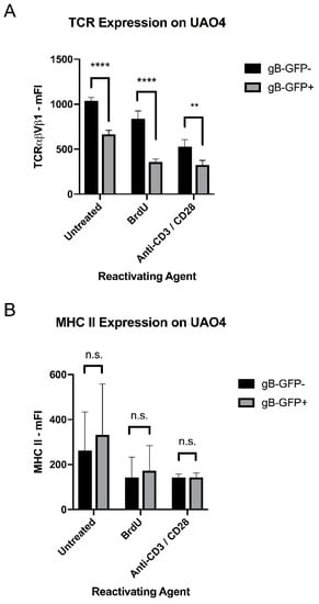 Reactivating MDV downregulates TCRαβVβ1. (A) Reactivating gB-GFP+ UAO4 cells downregulates surface expression of TCRαβVβ1, measured by TCR2 antibody fluorescence in flow cytometry. gB-GFP+ and gB-GFP- cells were gated within untreated, BrdU-treated, and anti-CD3/CD28 antibody-treated samples (averaged across three antibody dilutions, as reactivation was not concentration-dependent within the range tested). (B) Reactivating gB-GFP+ UAO4 cells express similar levels of MHC class II to latently-infected gB-GFP- UAO4 cells within the same sample, as measured by flow cytometry. n = 3 parallel-treated cell culture wells per treatment. ** p < 0.01, **** p < 0.0001 by Sidak’s multiple comparisons test. n.s. = no significant difference. mFI = mean fluorescence intensity.