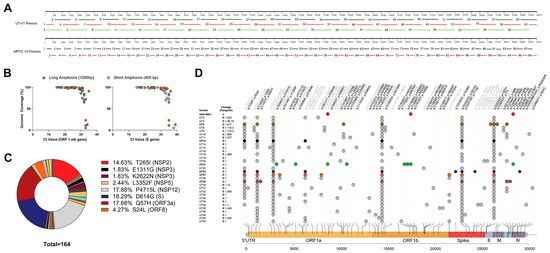 We used two primer schemes to generate amplicons for MinION library preparation, UT-V1, and Artic V3 (Figure 1A). We designed a UT-V1 disjointed primer amplicon tiling approach (i.e., adjacent primers are not in the same pool) that used sixty-one overlapping primer sets that were separated into three pools to generate 500 bp–1 kb amplicons (Figure 1A) [38]. The second approach used the ARTIC v3 primer set that generates ninety-eight 400 bp amplicons pooled into two PCR reactions. Both amplicon design schemes showed a genome coverage of 95–100% from NP swabs having Ct values < 30, and a genome coverage below 95% from NP swabs with Ct values > 30 (Figure 1B). The two primer sets showed drop-out regions at the ends of the genome, UT-V1 (approximately 1–460 nt and 29,580–29,903 nt), and ARTIC V3 (approximately 1–320 nt and 29,700–29,903 nt).