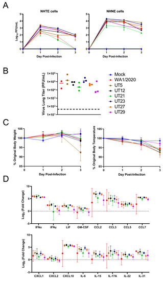 Considering the phenotypic outcomes in vitro and in vivo (Figure 2), we down-selected four virus isolates, UT5 (B.1.577), UT21 (A.1), UT23 (B.1), and UT29 (B.1), and WA1/2020 was used as a comparator for additional in-depth studies to reveal any potential variant-specific host responses in the K18-hACE2 mouse model. We also considered the origin of the virus. UT5 and UT23 were from hospitalized patients, while UT21 and UT29 were from outpatient samples. The UT21 isolate was chosen for further studies as it was the only virus isolate in the A lineage.