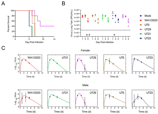 (A) Survival curves of female K18-hACE2 mice that were intranasally challenged at 1 × 104 PFU with either SARS-CoV-2 WA1/2020 (n = 4) or one of four clinical isolates UT5, UT21, UT23, or UT29 (n = 5). The study was completed at 14 dpi. (B,C) K18-hACE2 mice (50:50 male: female) were intranasally challenged with either a mock, SARS-CoV-2 WA1/2020, or one of four clinical isolates at 1 × 104 PFU, and were euthanized on 1, 3, or 5 dpi (n = 4 per timepoint). (B) The virus titer in the left lobe of the lung was measured via plaque assay (PFU/mL of half of the lung homogenate). The limit of detection of the plaque assay (horizontal dashed line) is 50 PFU. The symbol (#) represents one individual mouse without a measurable virus titer. (C) Fit of the viral kinetic model (Equations (S1)–(S4), Supplementary A) to viral loads from the lungs of female mice (top panel) and male mice (bottom panel) of WA1/2020 (red), UT21 (green), UT29 (violet), UT5 (brown), or UT23 (navy blue). Data are shown as geometric mean and standard deviation.