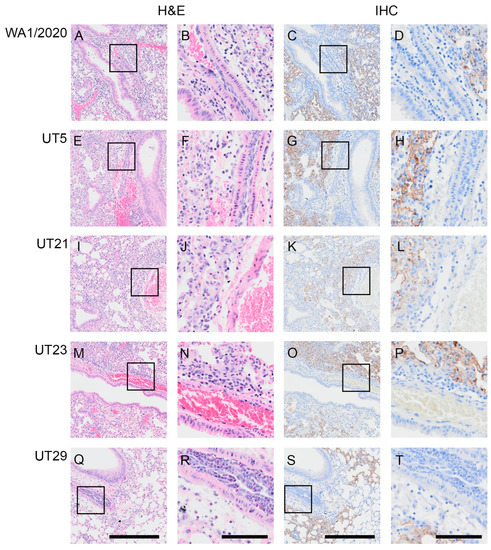 Margination and transmigration of inflammatory cells in pulmonary vessels of K18-hACE2 mice infected with WA1/2020, UT5, UT21, UT23, or UT29 at 5 DPI. Representative serial sections are presented for pulmonary vessels from mice at 5 dpi with WA1/2020 (A–D), UT5 (E–H), UT21 (I–L), UT23 (M–P), or UT29 (Q–T). Lungs were H&E-stained (A,B,E,F,I,J,M,N,Q,R) or IHC-labeled with antibody to the N protein of SARS-CoV-2 (C,D,G,H,K,L,O,P,S,T). The area outlined within each 100 µm image for each H&E and IHC set is shown to the right of each image. Scale bar = 100 µm for panels (A,C,E,G,I,K,M,O,Q,S). Scale bar = 25 µm for panels (B,D,F,H,J,L,N,P,R,T).