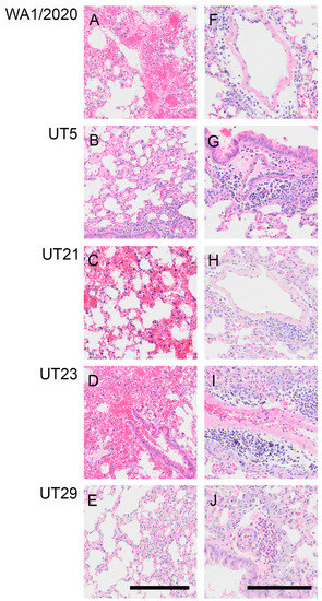 At 5 dpi, lungs of mice infected with WA1/2020, UT5, or UT29 showed inflammatory cell accumulation in the alveolar spaces (compare Figure 5A,B,E). Mice infected with WA1/2020 or UT21 exhibited hemorrhaging, widespread edema necrotic debris in the lumen of the bronchus, and multifocal necrosis with inflammation (Figure 5A,E). At 5 dpi, hemorrhage was present in the lungs of UT5-, UT21-, and UT23-infected animals (compare Figure 5B–D), which was not observed during infection with UT29 (Figure 5E). Representative images are presented in Figure 5 and highlight perivascular inflammation and edema characterized by infiltration of mononuclear cells from mice infected with WA1/2020 (Figure 5F), UT5 (Figure 5G), UT21 (Figure 5H), and UT23 (Figure 5I). Clusters of abundant eosinophils were present throughout the vasculature in UT29-infected mice at 5 dpi (Figure 5E,J). No clusters of eosinophils were observed in our evaluation of H&E slides from lungs of all other variant-infected mice. Only a few dispersed eosinophils or no single eosinophils were viewed in WA1/2020, UT5, UT21, and UT23 lung sections (Figure 4 and Figure 5H–J).