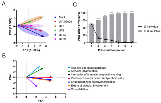 Principal component analysis and its biplot were generated using the severity scores of seven pathological features (alveolar edema/hemorrhage, alveolar inflammation, interstitial inflammation/septal thickening, peribronchiolar/perivascular lymphoid cells, endothelial hypertrophy/margination, extent of alveolar involvement, and consolidation) using 1, 3, and 5 dpi and six isolates (mock, WA1/2020, UT5, UT21, UT23, and UT29). Standardized scaling was used to generate the PCA plot and its corresponding biplot. A scatterplot was created using principal component 1 (PC1) and PC2 values, and arrows were drawn in to connect averaged 1 and 5 dpi values.