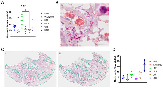 Quantification of neutrophil distribution and neutrophil density at 5 days pi within the lungs of SARS-CoV-2 infected mice. Neutrophils were stained pink with naphthol AS-D chloroacetate esterase (NACE) within lung tissues and counted. (A) Neutrophil density (cells/mm2) of each of the five SARS-CoV-2 virus isolates in n = 5 mice. * p < 0.05, one-way ANOVA with post-hoc Tukey HSD test. The adjusted p-value comparing UT5 and UT21 at 5 dpi is 0.0467. (B) Representative image to show NACE staining. (C) Method of calculating neutrophil density within lung tissue. (Panel (i)), the entire lung tissue was first outlined to obtain the area of the shape. Bronchioles, respiratory ducts, lymphatic vessels, and blood vessels were next outlined, and their combined square area was subtracted to estimate the total area of the tissue. (Panel (ii)), neutrophils were highlighted throughout the tissue and this number was divided by the total estimated area of the whole lung tissue. Only one lobe is shown for illustration of method. (D) The percentage of viable neutrophils at 5 dpi in the lungs of mice infected with five SARS-CoV-2 virus isolates in n = 3 mice. Graphs (A,D) show each virus with a distinct color and each point represents one mouse with the mean for each group.