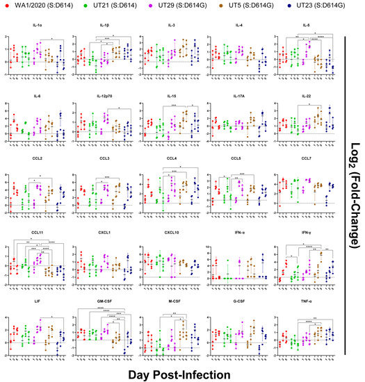 Immune protein response profiles of SARS-CoV-2 variants in lungs of K18-hACE2 mice (n = 4/virus per day) on days 1, 3, and 5 post-infection. Innate immune responses in lung following infection of K18-hACE2 mice with SARS-CoV-2 isolates were measured and protein concentration of each analyte were log2 (fold-change) transformed following comparison to mock. The mean and multiple comparisons at 95% confidence intervals are presented. Legend: WA1/2020 (red), UT21 (green), UT29 (violet), UT5 (brown), or UT23 (navy blue); * = p < 0.05, ** = p < 0.01, *** = p < 0.001, **** = p < 0.0001.
