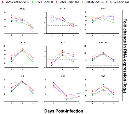 Selected gene expression profiles of lungs from K18-hACE2 inoculated with mock or SARS-CoV-2 variants. RNA was isolated from lungs (n = 4) harvested from mice on 1, 3, and 5 dpi and analyzed with a QuantiGene Plex panel targeting 50 genes (Table S7). V = To calculate gene expression, the measured average background fluorescent intensity of each measured gene was subtracted from mean fluorescent intensity of each gene in each sample. These values were normalized to that of an endogenous control within each sample. Normalized expression values were used to calculate log2 fold change as compared to that of mock-infected mice. Data are shown from WA1/2020 (red), UT21 (green), UT29 (violet), UT5 (brown), and UT23 (navy blue). The dotted line in each graph represents log2 fold change = 1.5.