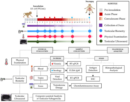 At preestablished times (Day −5 to Day 21) after ZIKV inoculation, all animals in the experiment were monitored for different clinical parameters. Fecal collection was performed daily, starting 5 days before ZIKV inoculation (Days −5 to 21). Testicular biometry and a physical examination were performed, and blood was collected for laboratory tests on alternate days (Days 0, 3, 5, 7, 10, 14, and 21). Ultrasonographic examinations were performed weekly (Days 0, 7, 14, and 21) (Figure 1).