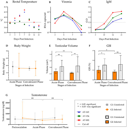 Noninvasive evaluation of experimental ZIKA infection in male S. collinsi. (A) Measurement of rectal temperature, showing feverish period of infected group between 3 to 10 dpi. The dashed line represents the temperature cut-off based in control group data. The (B) RNA viral load in blood by RT-qPCR and (C) IgM antibody profile of the infected group detected from 14 dpi. The dashed line represents the cut-off of ELISA assay. Group evaluation, mean and min-max values: (D) body weight, (E) testicular volume, (F) gonadosomatic index, and (G) testosterone by stages of infection, highlighting the decrease of testicular volume, GSI and testosterone values during acute phase of infection in G1.