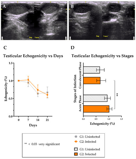 The total testicular echogenicity was 0.8144 ± 0.207% and 0.8424 ± 0.199% for G1 and G2, respectively. Although subjective analysis of ultrasonographic images showed a slight difference between some animals in both groups (Figure 3A–C), no significant difference was observed between G1 and G2 (Figure 3D). However, G2 animals showed considerable testicular echogenicity loss in the convalescent phase (Figure 3D) compared with the acute phase (p = 0.010).