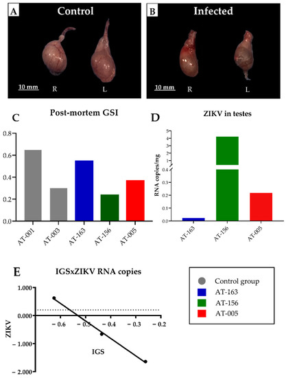 Postmortem evaluation of experimental ZIKA infection in male S. collinsi. (A) Control animal AT-001, macroscopy of the right and left testes. (B) Infected animal AT-156, macroscopy showing a slight difference in size between the right and left testes. (C) Postmortem GSI graph at 21 dpi of each animal. (D) Graph of the detection of ZIKV RNA copies/mg in a pool of both testes of each infected animal. (E) Graph of Pearson’s correlation: demonstrating a significant inverse and very strong correlation between GSI X ZIKV tissue variables, R-value = −0.9986 and p = 0.033.