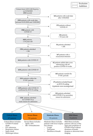- Van Goethem, N.; Chung, P.Y.J.; Meurisse, M.; Vandromme, M.; De Mot, L.; Brondeel, R.; Stouten, V.; Klamer, S.; Cuypers, L.; Braeye, T.; et al. Clinical Severity of SARS-CoV-2 Omicron Variant Compared with Delta among Hospitalized COVID-19 Pa-tients in Belgium during Autumn and Winter Season 2021–2022. Viruses 2022, 14, 1297. [Google Scholar] [CrossRef] [PubMed]