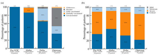 (a) COVID-19 vaccination status per variant wave; (b) NIH severity scores per variant wave.