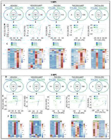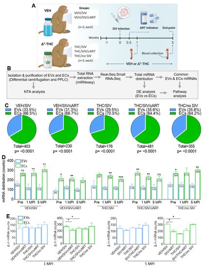 Here, we sought to determine the effects of THC on EVs and ECs miRNAome from viremic animals. For this purpose, paired EVs and ECs isolated from blood plasma collected at 1 MPI and 5 MPI from RMs in Group 1 (VEH/SIV) and Group 2 (THC/SIV) were analyzed (Figure 1).