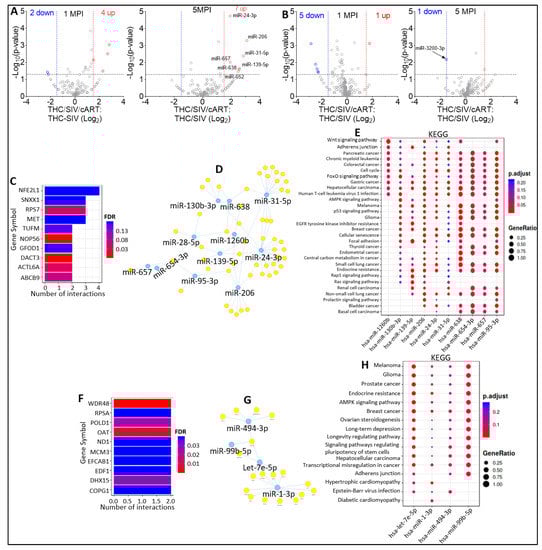 Alterations in miRNA profile of THC-treated, SIV-infected, cART-treated RMs. (A) Volcano plot showing down-(blue) regulated and up-(red) regulated miRNAs in THC/SIV/ART EVs relative to THC/SIV EVs at 1 MPI (left) and 5 MPI (right). (B) Volcano plot showing down-(blue) regulated and miRNAs in THC/SIV/ART ECs relative to THC/SIV ECs at 1 MPI (left) and 5 MPI (right). (C) miRNA-target enrichment analysis showing top target genes by number of interactions for the 13 significantly modulated EV-associated miRNAs (miR-130b-3p, miR-654-3p, miR-28-5p, miR-95-3p, miR-144, miR-1260b, miR-24-3p, miR-206, miR-31-5p, miR-657, miR-139-5p, miR-638, miR-652) at 1 MPI and 5 MPI. (D) Visualization of miRNA-target interaction network for the 13 significantly modulated EV-associated miRNAs. The blue circles represent the miRNAs, while the target genes are represented by the yellow circles. Pathways are represented by blue lines. (E) Dot plot of functional enrichment analysis for the 13 significantly modulated EV miRNAs. Color of dots represent adjusted p-values (FDR) and size of dots represents gene ratio (number of miRNA targets found enriched in each category/number of total genes associated to that category. (F) miRNA-target enrichment analysis showing top target genes by number of interactions for the 7 EC-associated miRNA significantly modulated at 1 MPI and 5 MPI. (G) Visualization of miRNA-target interaction network for the 7 EC-associated miRNA significantly modulated at 1 MPI and 5 MPI. The blue circles represent the miRNAs, while the target genes are represented by the yellow circles. Pathways are represented by blue lines. (H) Dot plot of functional enrichment analysis for target genes of the 7 EC-associated miRNA significantly modulated at 1 MPI and 5 MPI. Color of dots represent adjusted p-values (FDR) and size of dots represents gene ratio (number of miRNA targets found enriched in each category/number of total genes associated to that category.